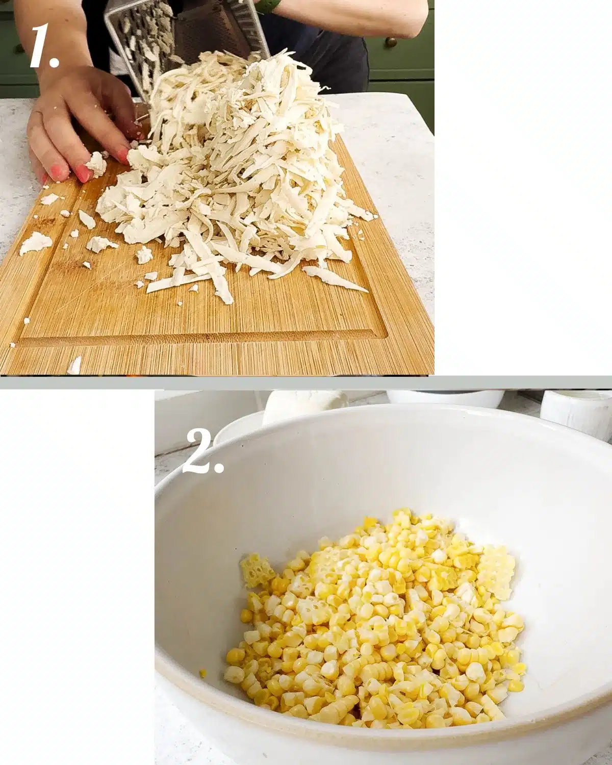 - Grate the tofu and remove the kernels from the corn cob if using fresh corn on the cob. Finely chop the spring onion.